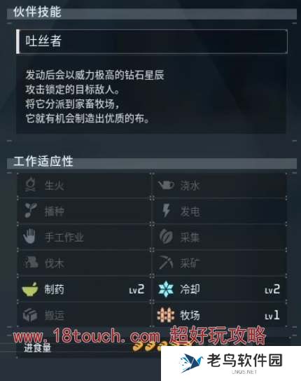 6、绸笠蛾是冰属性的帕鲁,工作适应性为制药LV2、冷却LV2、牧场LV1,外表十分优雅,放在基地牧场中工作可以产出大量的布。