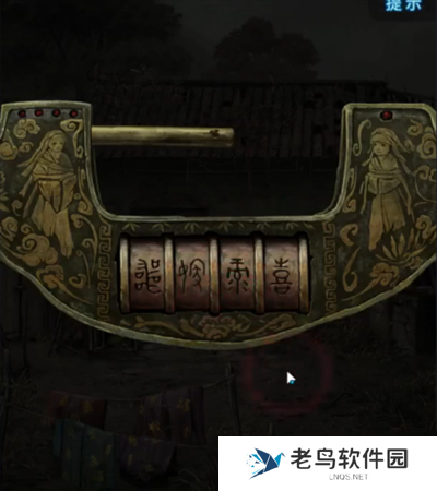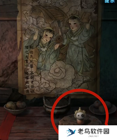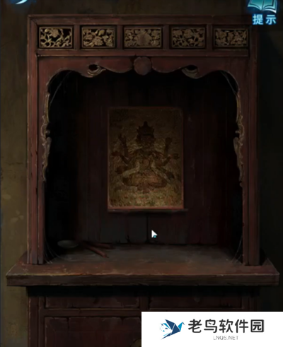 18、将金箔置入宅内空佛龛,获得缎布,返往左侧小屋,将缎布、热熨斗及时钟置上桌,依"2342"原则完成游戏,获取帛画。