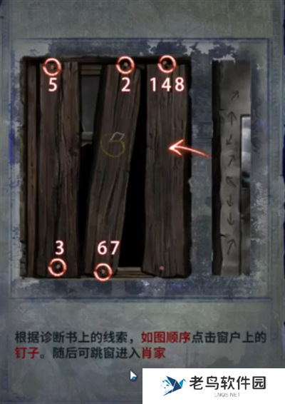 4、将小米喂给左侧纸扎鸡,获得诊断证书和蛋壳,按照下图顺序安装钉子然后就可以进入。