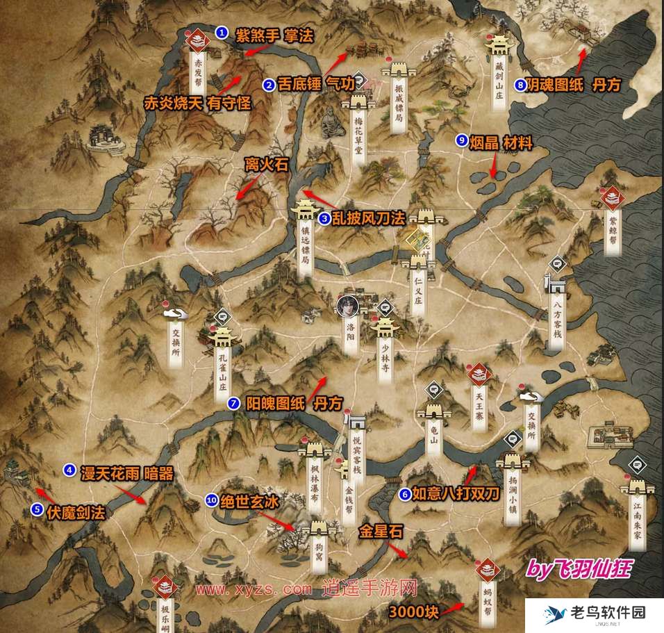玩家进入游戏地图后首先要收集地图上的宝箱,地图上13个宝箱里有6本金色功法,大家可以参考上图前往游戏内寻找收集。