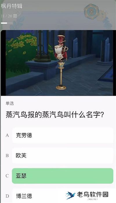11、蒸汽鸟报的蒸汽鸟名为?答案:C、亚瑟。