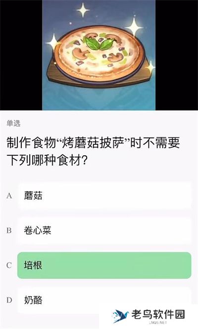16、制作“烤蘑菇披萨”过程中无需哪种食材?答案:C、培根。