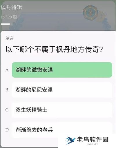 16、以下哪个不属于枫丹地方传说?答案:A、湖畔的微微安涅。