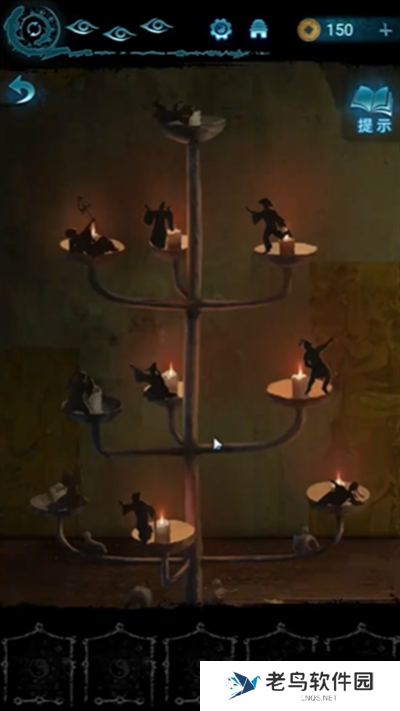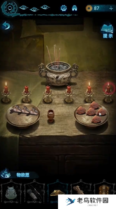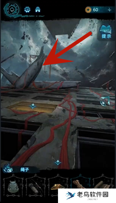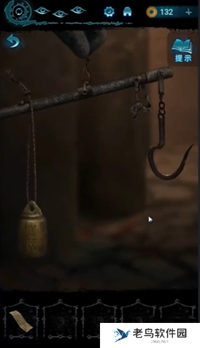 17、将心型雕塑传至老肖处,放在秤杆上取得物欲愿;对话后于左下方拾取绳子、木雕与纸条。
