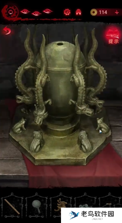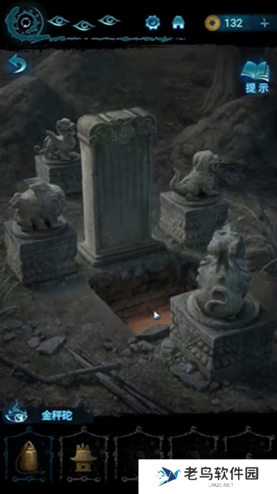 9、解完迷宫任务后,铜鼎浮现,将铜像放入水中传送至老肖处,放置于座台上获取金秤砣、寺庙金雕,查看线索。