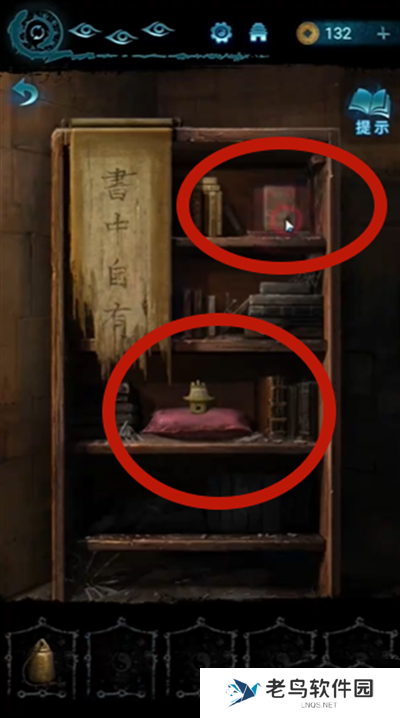 11、进入密室后,围绕书架观察,将寺庙金雕置于其上,查看书籍获取信息。