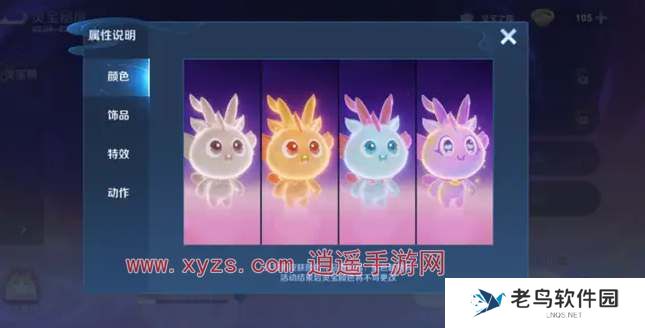 2、灵宝有四个属性,颜色、饰品、特效对应外观效果。动作则是在游戏内进行展示的。