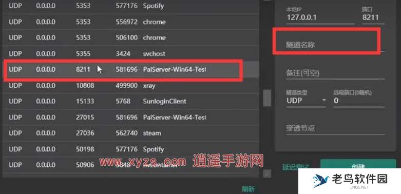 6、点击隧道点加号找到8211这个PalServer-Win64-Tes1幻兽帕鲁的服务器导致,在右侧设置隧道名称,点延迟检测并选择节点,完成创建。