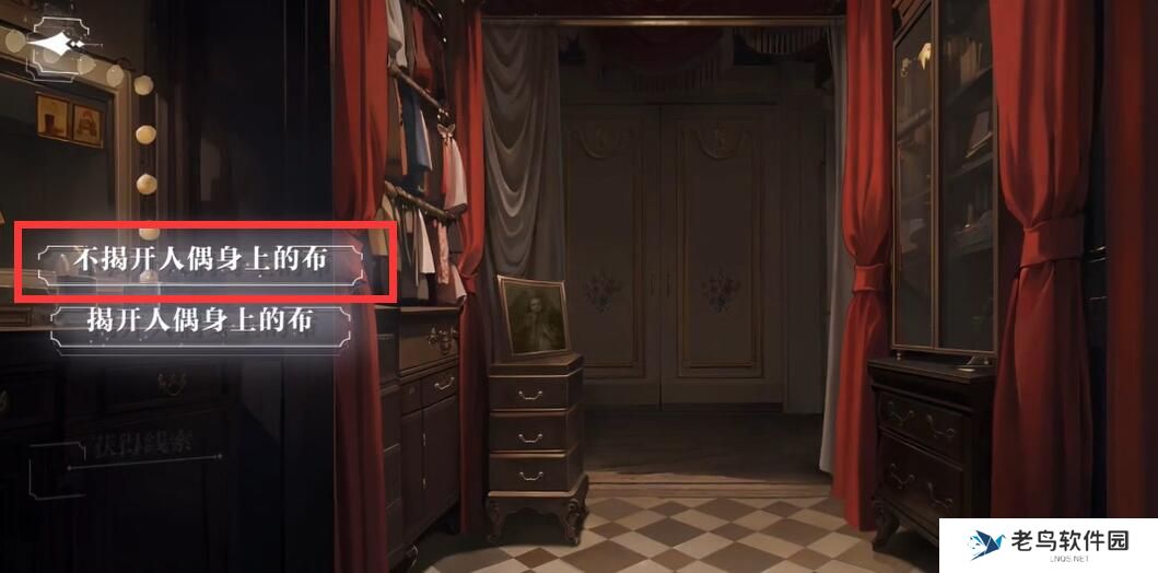 1、前两个房间不变,在房间三选择【揭开人偶身上的布】,然后和窗帘后的人偶对话。