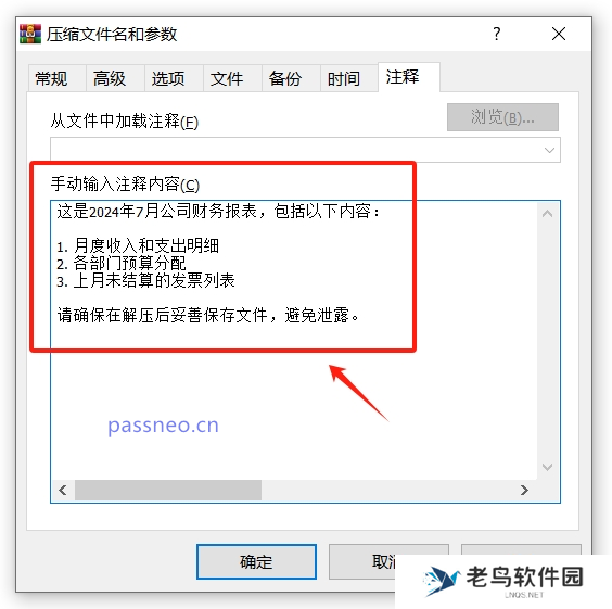 4、选中“注释”按钮后,在“手动输入注释内容”下方的输入框输入相关的注释内容。例如:你可以写下文件的版本、内容、注意事项或任何相关的使用说明。最后点击“确定”开始压缩文件。
