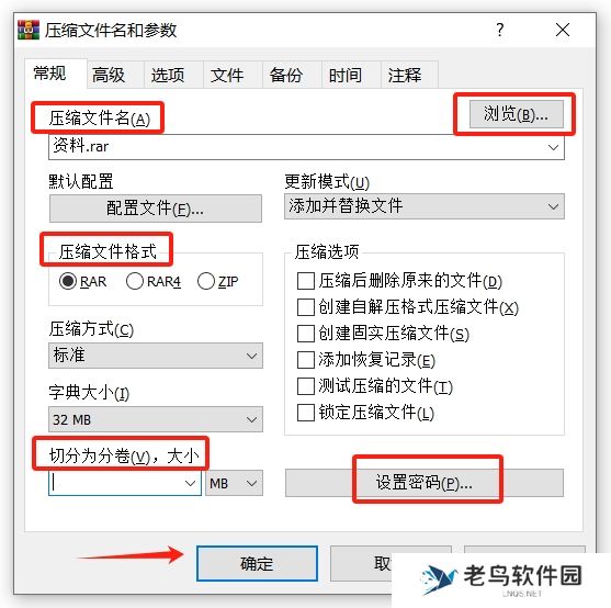 2、弹出“压缩文件名和参数”窗口后,在“常规”界面中,确认其他设置(如压缩格式、压缩方式、设置密码等)。