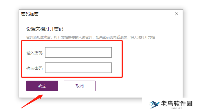 2、在“密码加密”对话框的空白栏里输入想要设置的密码,并再次确认,然后点击“确定”并保存文件。